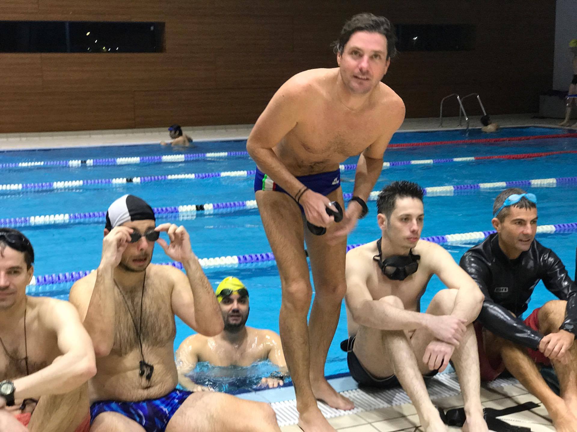 Si noi instructorii invatam permanent. In imagine colegii instructori de la Apnea Academy International, stagiu de pragatire Deep Inside - Mental Training, la cel mai adanc bazin din lume cu o adancime de 42m.